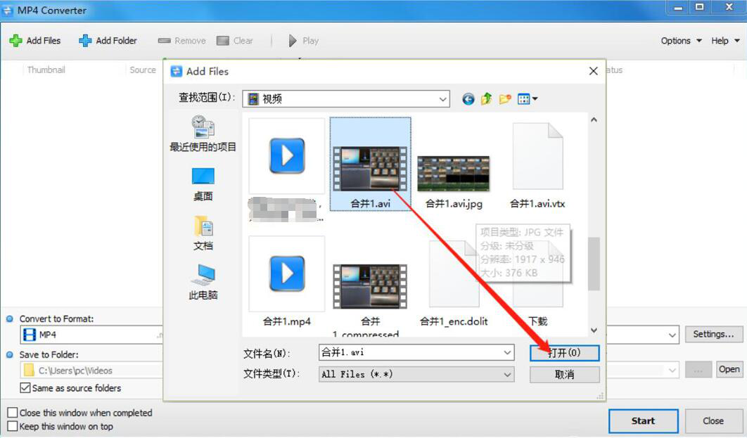 2、然后,在弹出的窗口中,将需要转MP4的AVI视频文件选中,并点击“打开”按钮,将其导入Tomabo MP4 Converter。