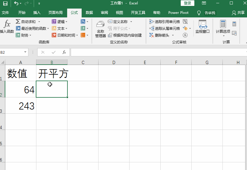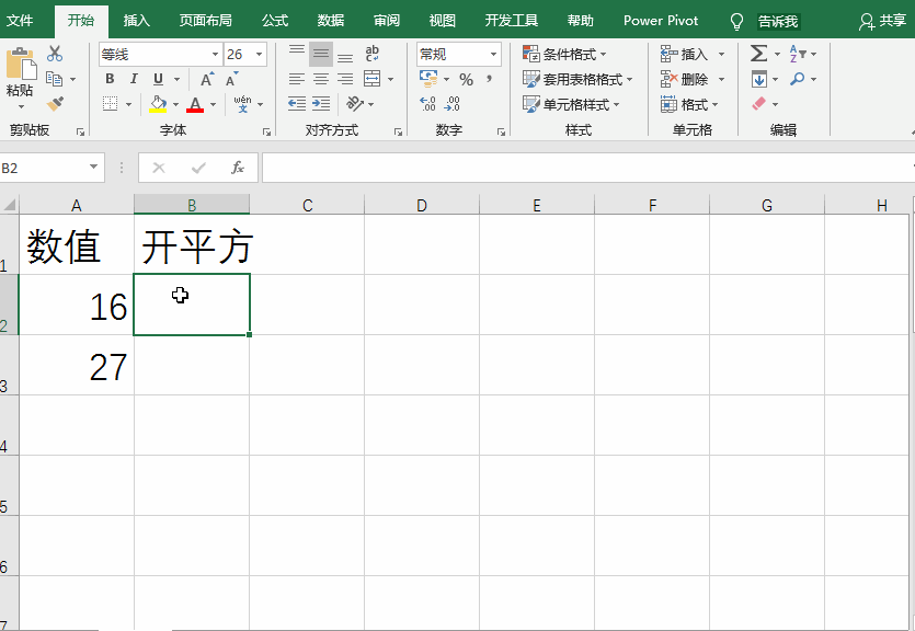 在B2单元格中输入公式【=A2^(1/2)】,点击回车键,就可以得到结果了。注意,“^”符号表示幂,我们要求A2中数据的1/2次幂,从而实现开平方。