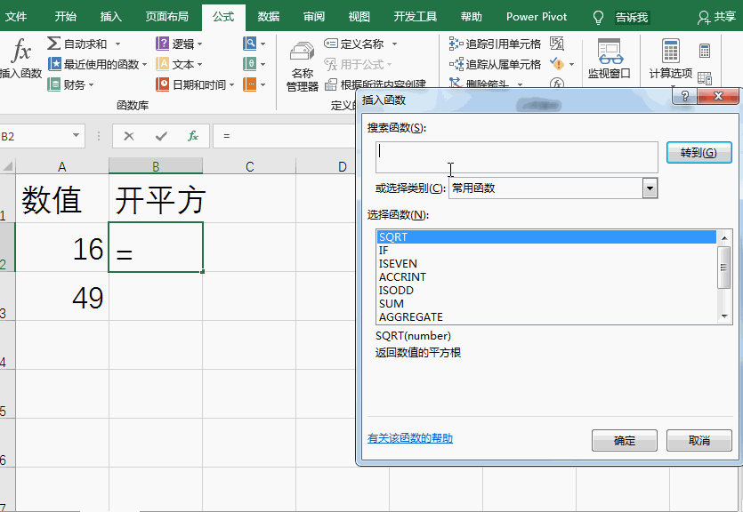选中B2单元格,在菜单栏点击【公式】——【插入函数】,弹出窗口,如图,输入【平方根】,点击【转到】,选择SQRT函数,然后设置函数参数,在界面中点击单元格A2,即可计算开平方。