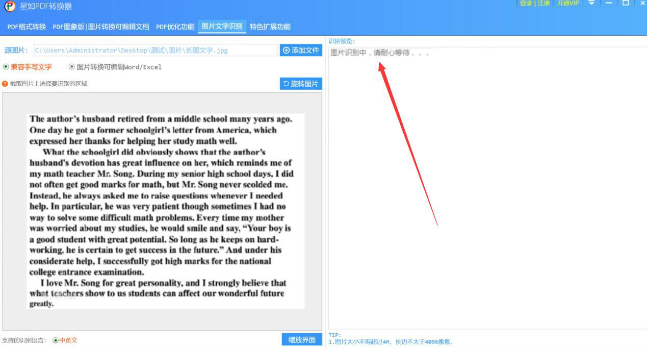 4、此时,在界面右侧的识别预览窗口中,我们可以看到星如PDF转换器正在识别图片上的文字。