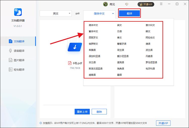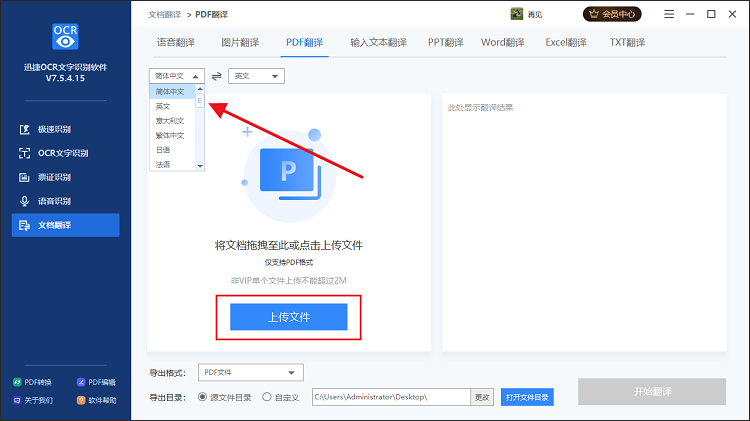 进入PDF翻译界面,点击【上传文件】按钮,导入PDF文件,再对翻译前后的语言进行调整,软件支持多种语言,