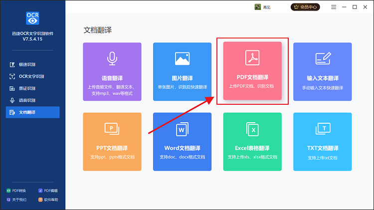 下载安装迅捷OCR文字识别软件,打开软件,进入界面,点击【文档翻译】,选择【PDF文档翻译】功能,