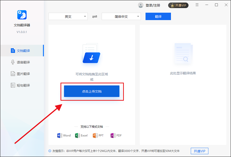 先要下载安装迅捷文档翻译器,打开软件,进入界面,如图,软件支持文档翻译、语音翻译、图片翻译、短句翻译功能,在左侧栏点击【文档翻译】,导入相关文档,
