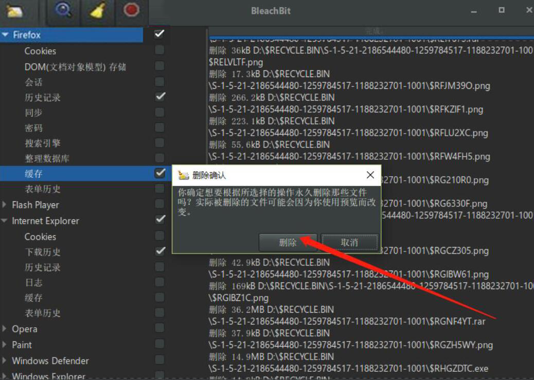 5、此时,Portable BleachBit会弹出删除确认的小窗口提示,我们直接点击“删除”按钮,Portable BleachBit便会清理所选的电脑磁盘文件。