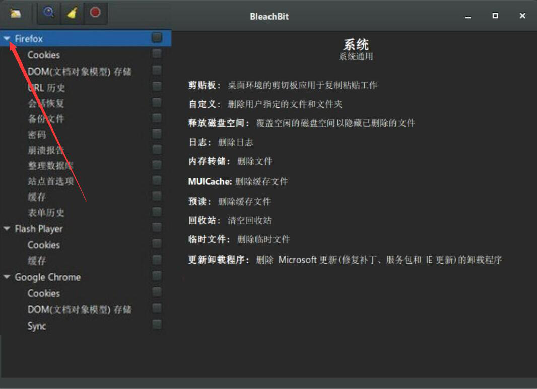 1、首先,我们打开Portable BleachBit,在软件界面的左侧,可以看到它有很多不同类型的电脑文件,点击倒三角图标按钮,即可详细了解对应的选项内容。