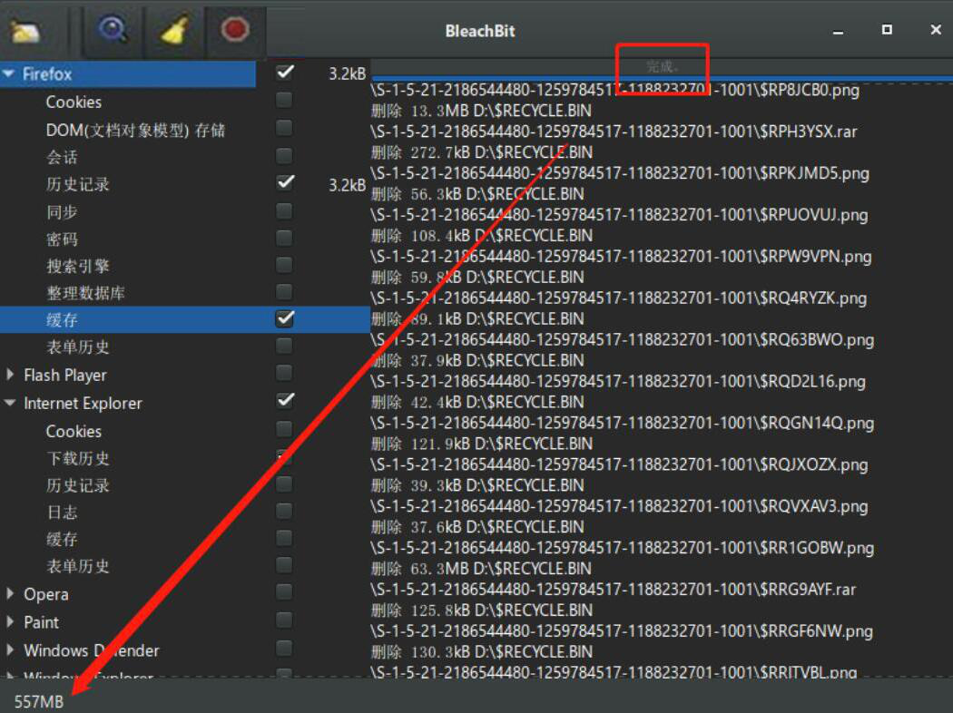 6、最后,当界面中显示“完成”的字眼提示时,则说明Portable BleachBit成功地将所选的电脑磁盘文件一并删除了。我们可以在界面左下方看到清理电脑磁盘后所释放的可用空间。