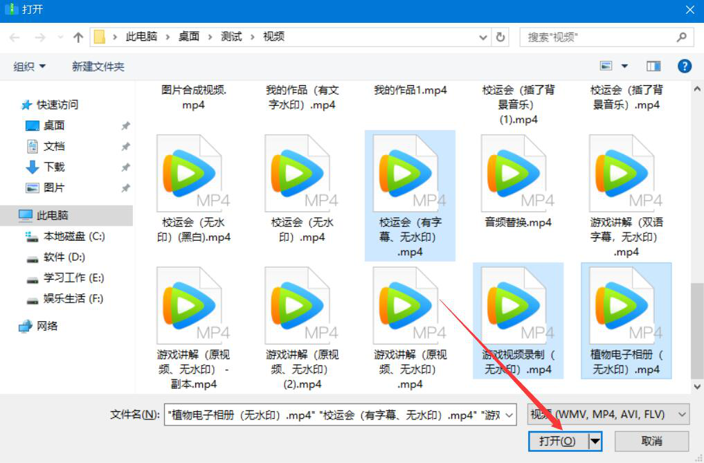 3、然后,在弹出的窗口中,我们选择需要批量压缩的视频,并点击“打开”按钮,将其一并导入迅捷压缩。