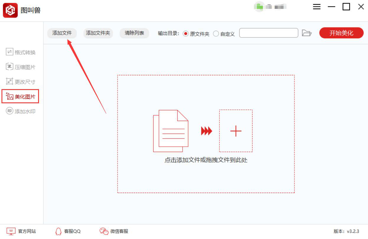 1、首先,我们打开图叫兽,先点击切换“美化图片”功能界面,并点击界面左上方的“添加文件”按钮。