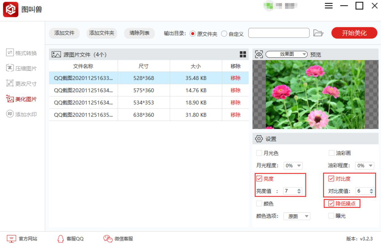 3、然后,在图叫兽的美化图片操作界面的右侧,我们可以看到它有多种美化图片的功能。例如,这里,我们勾选亮度、对比度、降低噪点,并分别调整强度。如下图所示,可以在预览窗口中同步看到图片美化的效果。