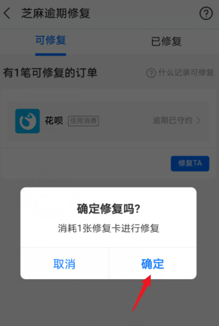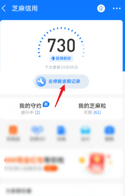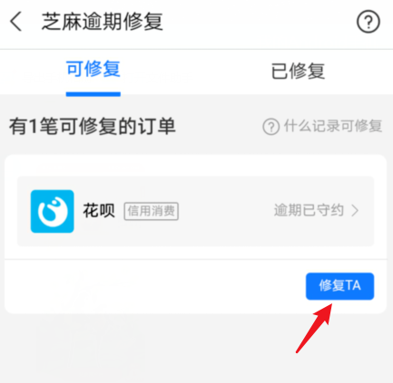 进入芝麻逾期修复窗口,使用芝麻粒兑换逾期修复卡,