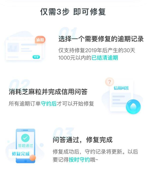第二步:消耗芝麻粒并完成信用问答(所有逾期订单守约后才可以开始修复),芝麻粒是芝麻用户在完成守约行为或信用任务之后获得的奖励,比如共享单车还车、花呗按时还款等。