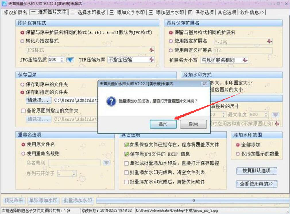 8、最后,如果弹出如下图窗口提示,就说明天音批量加水印大师已经完成了给图片批量添加文字水印的命令。我们点击“是”按钮,即可快速打开添加了文字水印的图片。