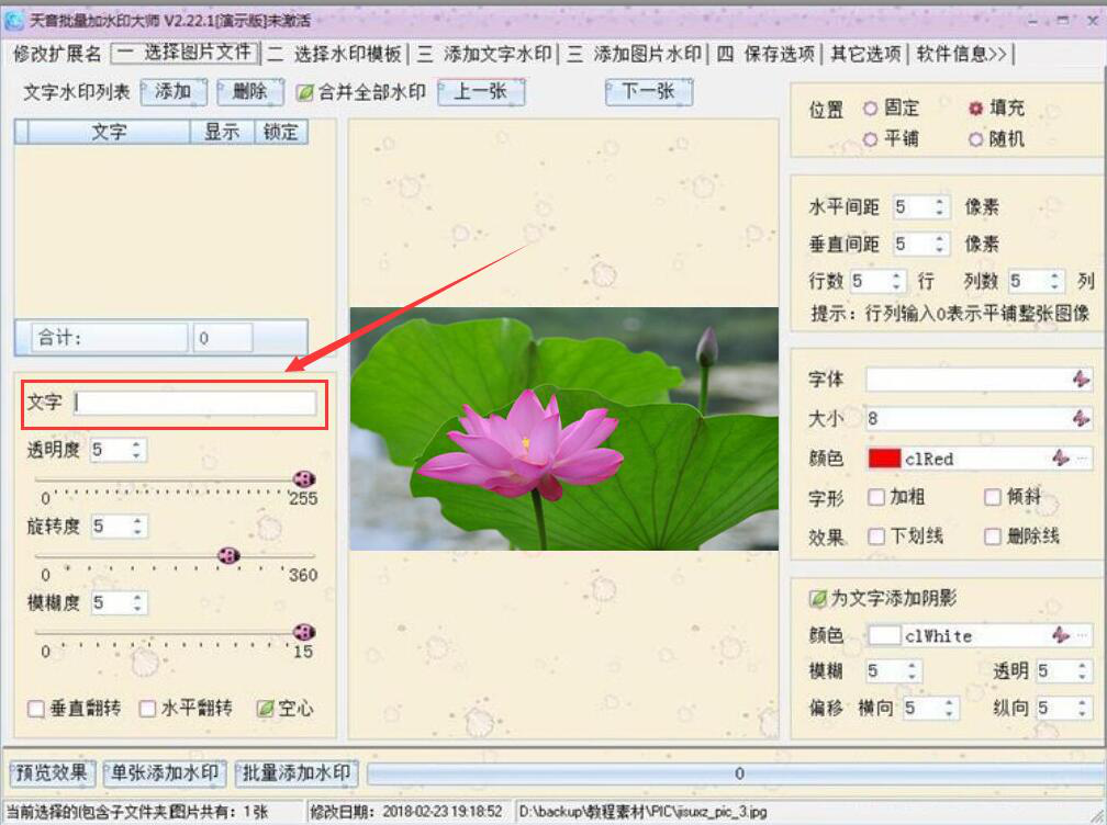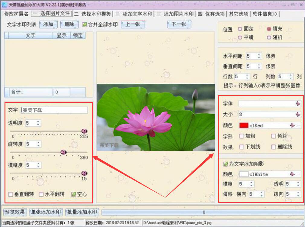 4、为图片批量添加的文字水印输入完成后,在图片中会同步看到效果。我们也可以调整文字水印的透明度、旋转度、模糊度、字体类型、字体大小、字体颜色、阴影等等,如下图所示。