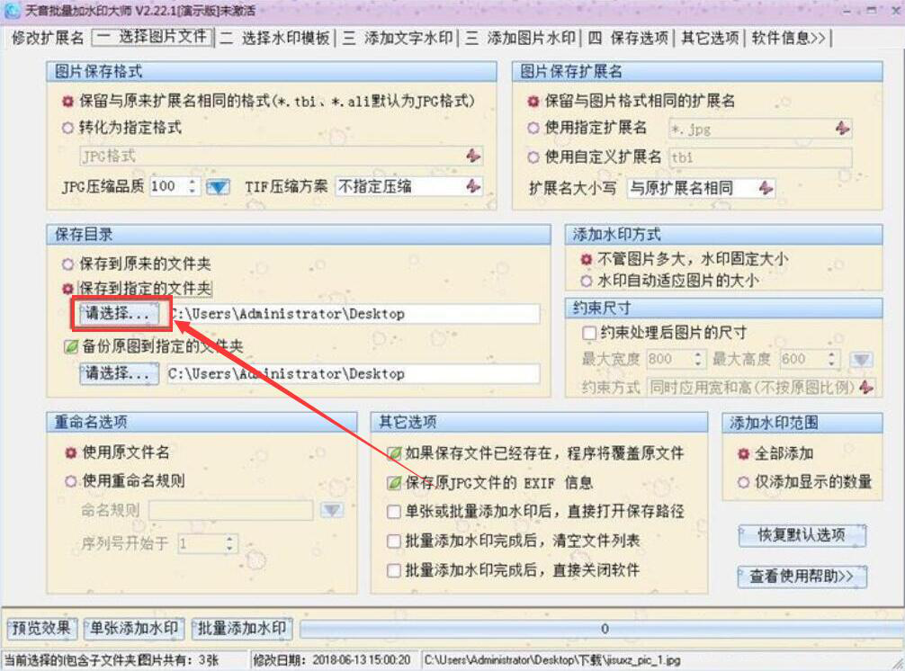 5、接下来,我们在天音批量加水印大师的菜单栏中,切换至“四 保存选项”操作界面,点击保存目录中的“请选择”按钮,从而继续下一步路径的设置。