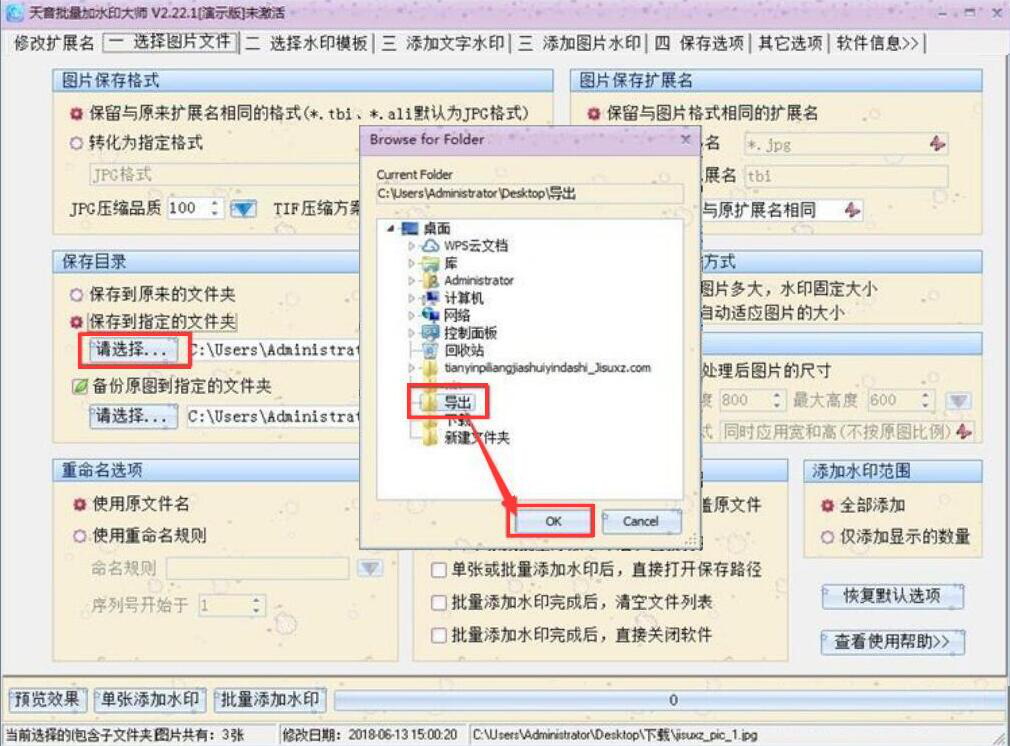 6、此时,天音批量加水印大师便会弹出如下图窗口,我们选择批量添加了文字水印后的图片的保存路径,再点击“OK”按钮。