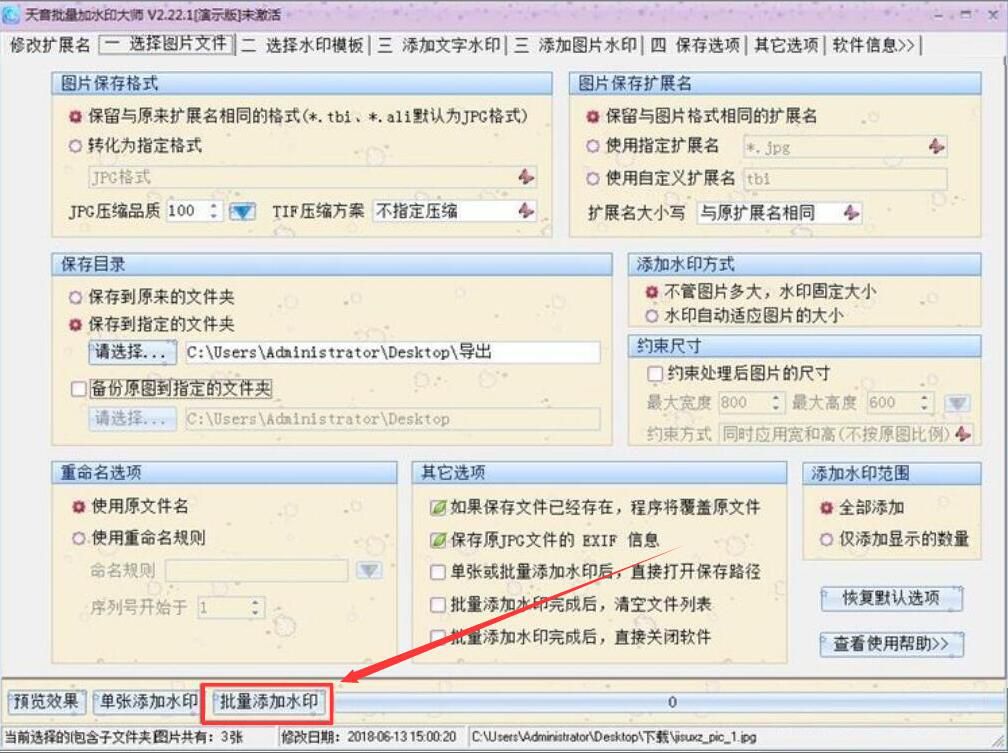 7、图片的文字水印及保存路径都设置完成后,我们点击界面左下方的“批量添加水印”按钮,天音批量加水印大师便开始为图片批量添加文字水印。