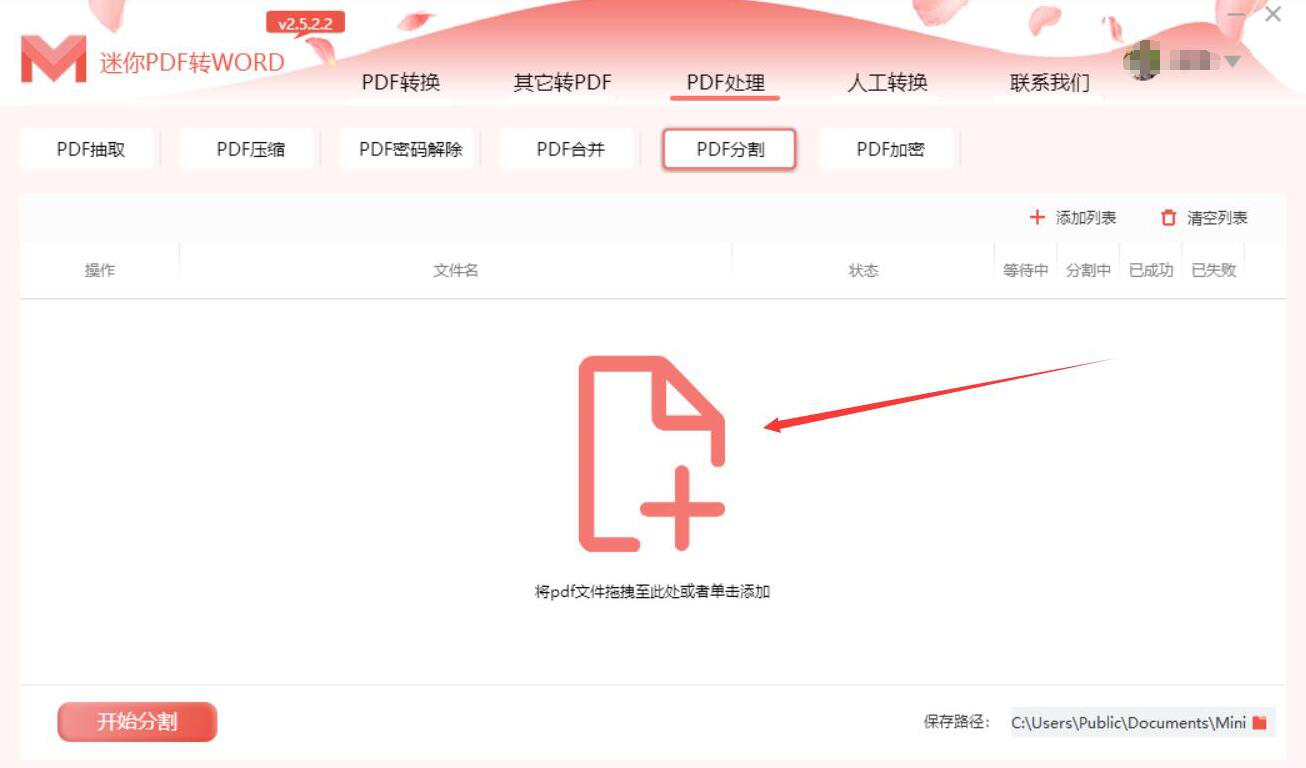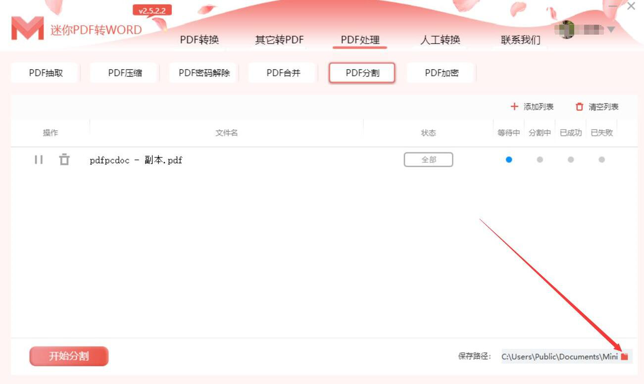 7、最后,我们点击界面左下方的“开始分割”按钮,迷你PDF转WORD便开始分割PDF文件,分割完成后,会自动保存到指定路径。
