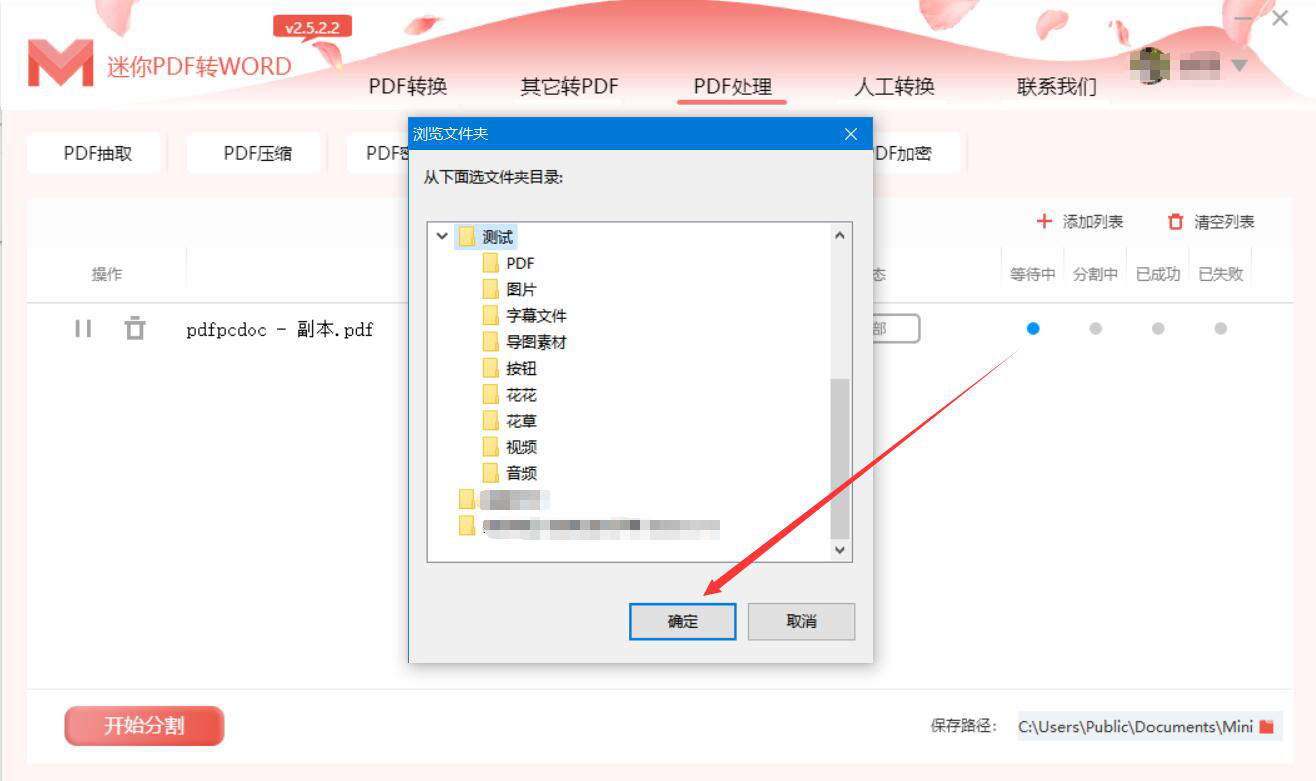 6、在迷你PDF转WORD弹出的浏览文件夹窗口中,我们设置PDF文件分割后保存的路径,再点击“确定”按钮。