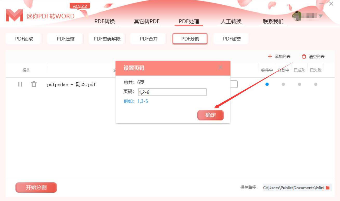 4、此时,迷你PDF转WORD软件便会弹出设置页码的小窗口。我们在页码的编辑框中输入自己想要分割PDF文件的范围,再点击“确定”按钮。