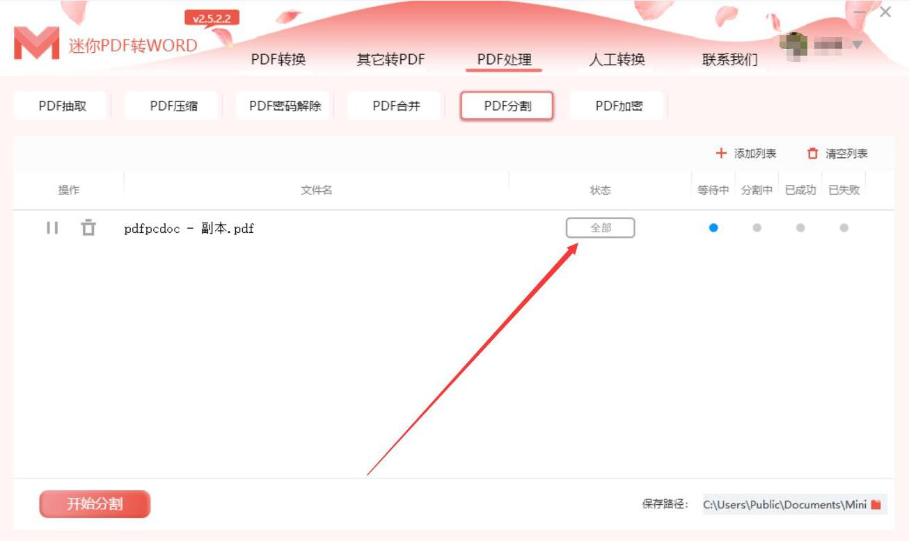 3、然后,回到迷你PDF转WORD软件的PDF分割操作界面,我们点击“全部”按钮。