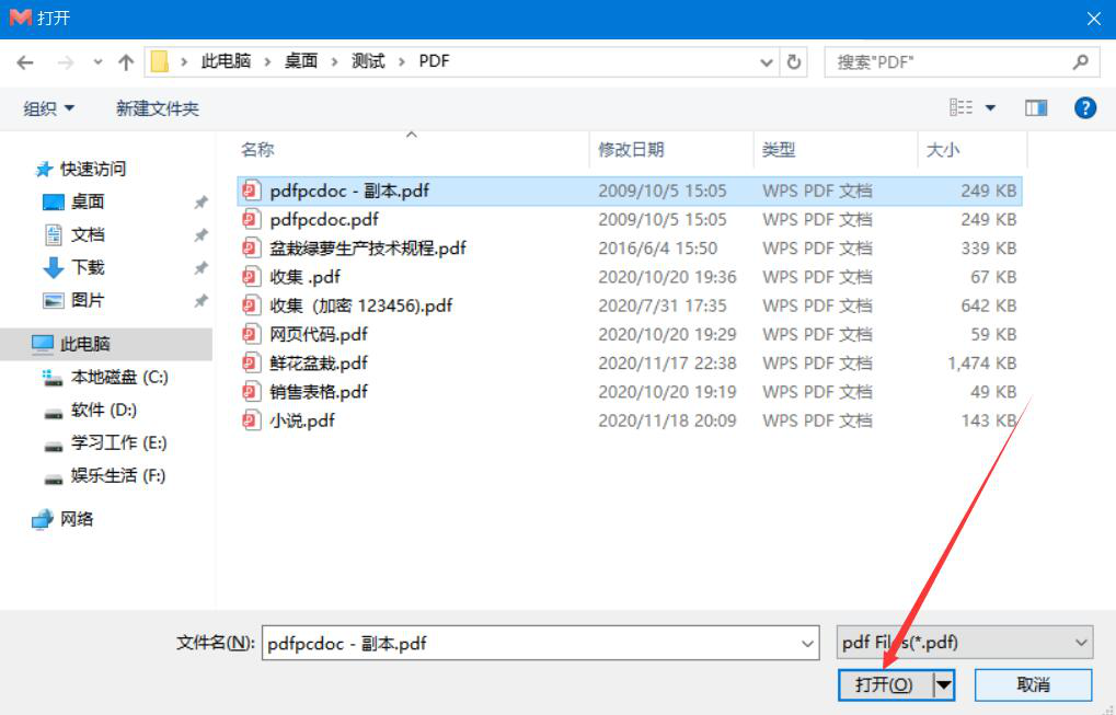 2、在弹出的窗口中,我们选择需要分割的PDF文件,并点击“打开”按钮,将其导入迷你PDF转WORD软件。
