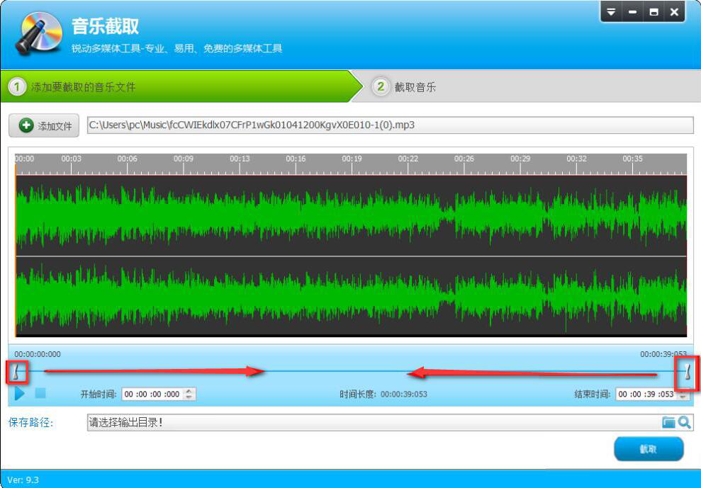 4、需要截取片段的音频成功导入后,我们通过拉动音频轨道下方的两个光标按钮来选取需要音频转换专家截取的音频片段。
