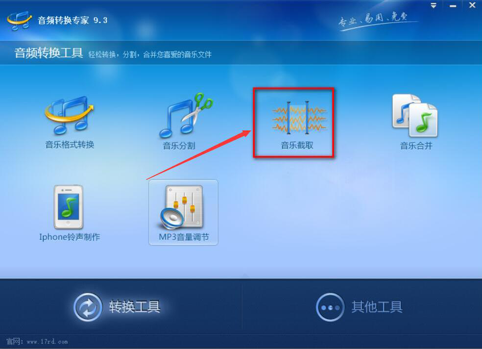 1、首先,我们打开音频转换专家。在其功能向导页面中,点击“音乐截取”选项。