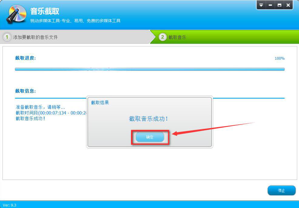 8、最后,弹出截取结果的小窗口提示,如下图,说明音频转换专家成功截取了该音频片段,我们直接点击“确定”按钮即可。