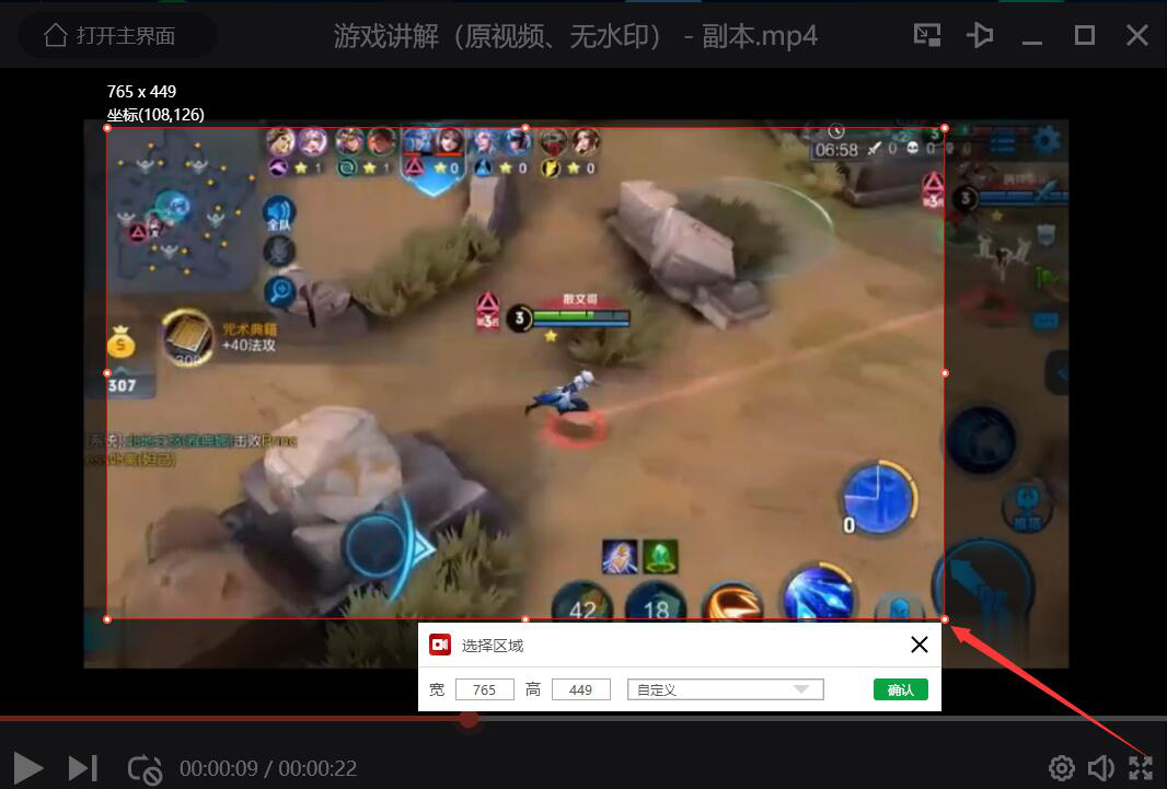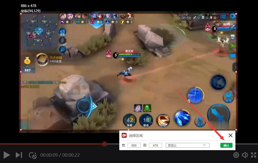 4、当录制视频的区域选定后,我们可以在选择区域的小窗口中,可以看到视频录制区域的宽、高,点击“确认”按钮。