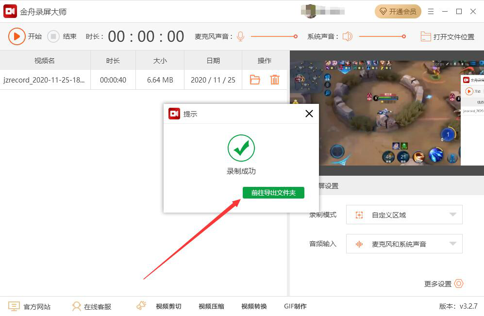 9、最后,当操作界面弹出如下图的窗口提示时,则说明金舟录屏大师完成了视频的录制。我们点击“前往导出文件夹”按钮,即可得到自己录制好的视频。