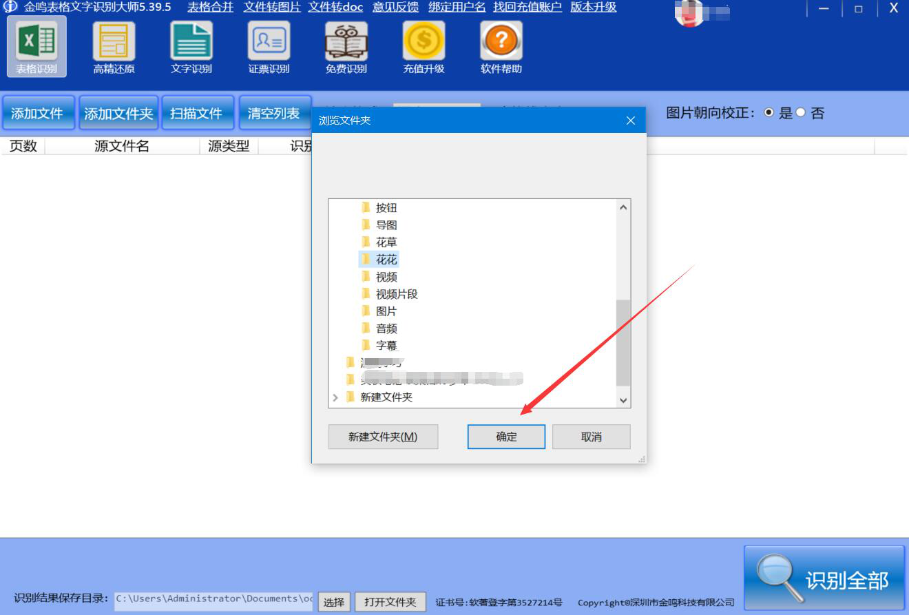 2、然后,在金鸣表格文字识别大师弹出的窗口中,我们选择PPT转图片后的保存路径,并点击“确定”按钮。