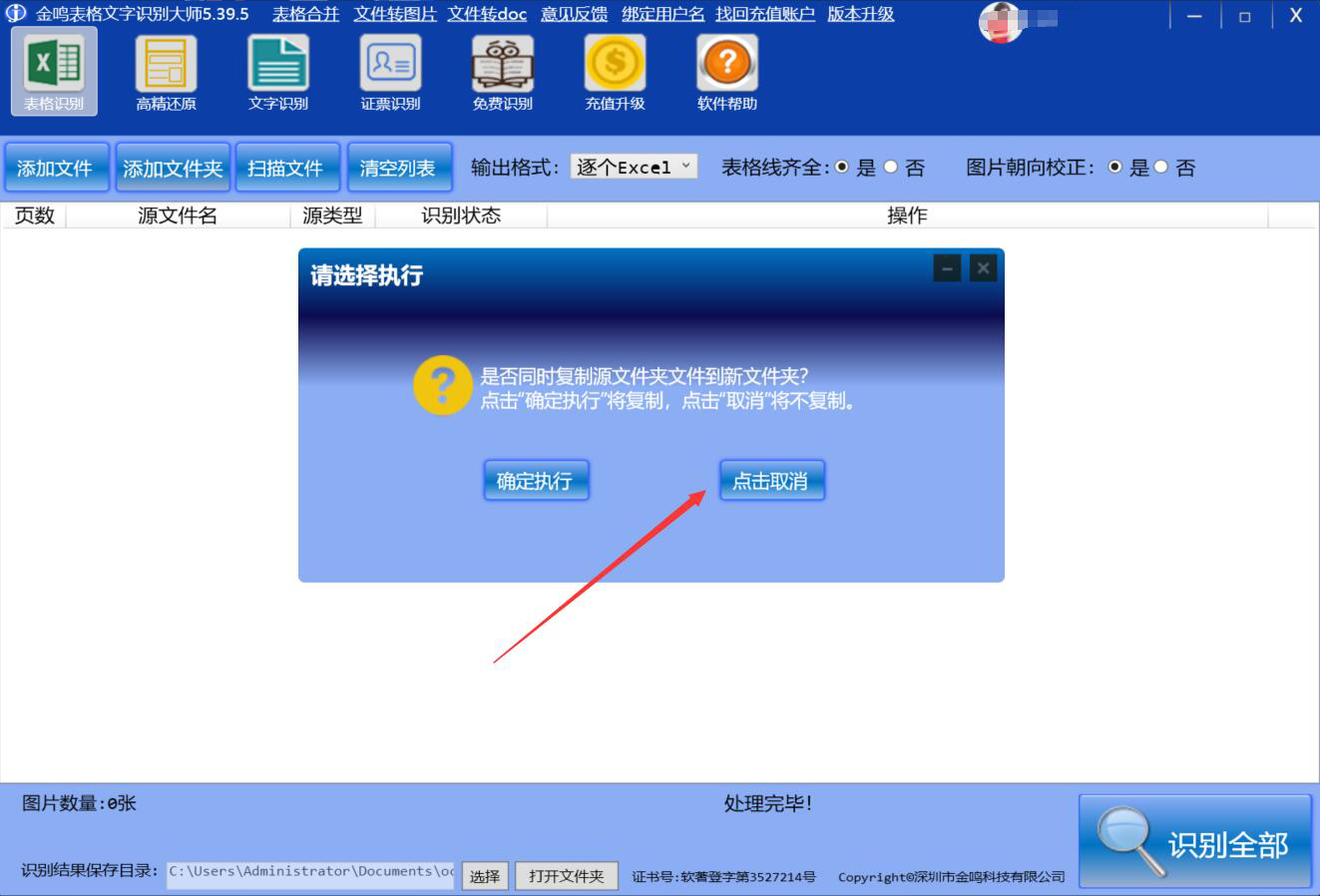 3、此时,金鸣表格文字识别大师会弹出执行窗口,我们根据自己的需要选择源文件夹文件是否复制到新文件夹。例如,这里,我们点击“取消”选择不复制。