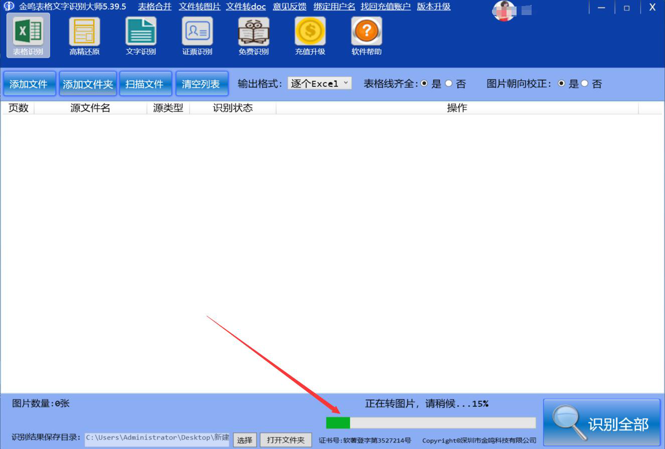 6、接着,我们在界面下方便可以看到金鸣表格文字识别大师将PPT转图片的具体进度。