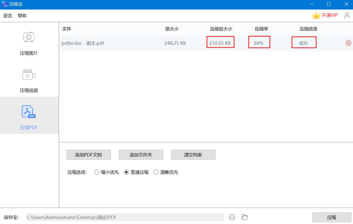 7、最后,若导入的PDF文件的压缩进度一栏中显示“成功”,则说明压缩宝成功地压缩了PDF文件并将其保存起来了。我们可以看到PDF文件压缩后的大小和压缩率,如下图所示。