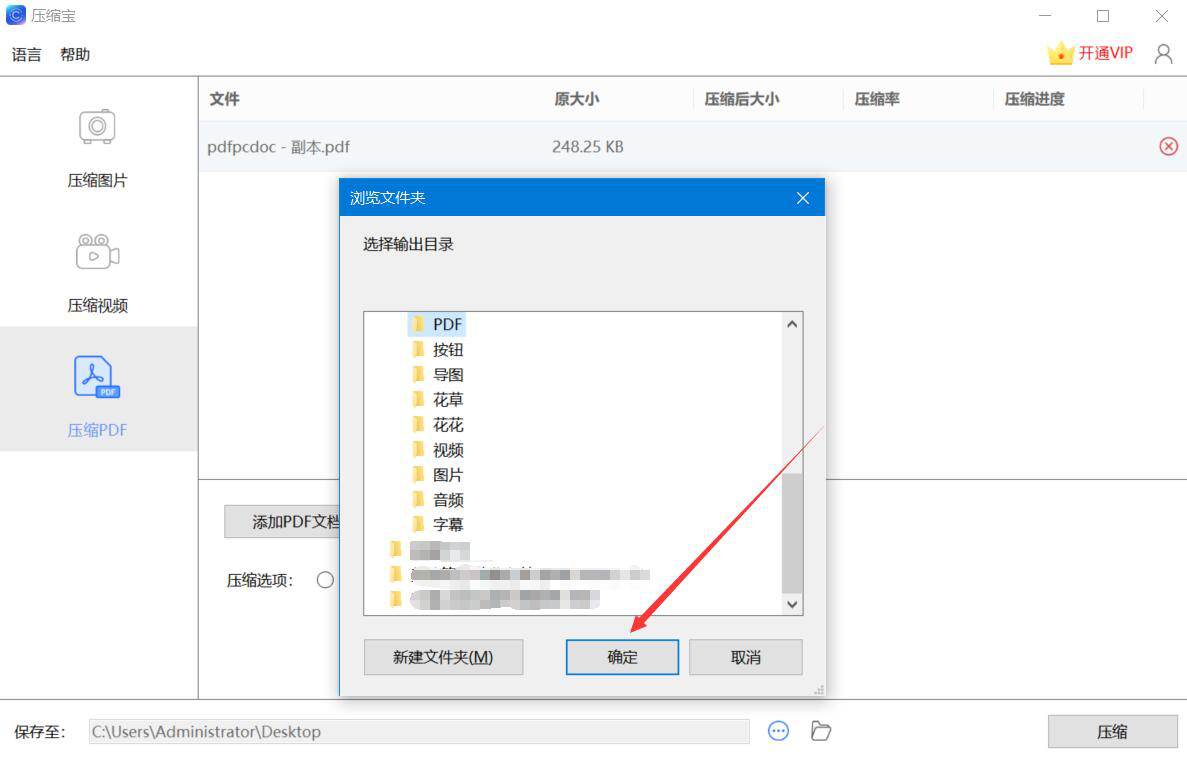 5、此时,压缩宝会弹出浏览文件夹的窗口,我们选择PDF文件压缩后的保存路径,再点击“确定”按钮。