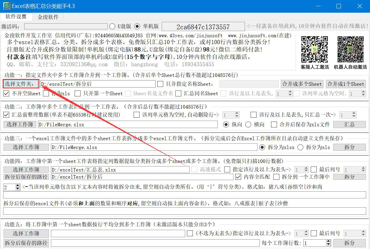 2、例如,我们选择的是第一种合并Excel文件的方式,就在Excel表格汇总分类能手操作界面的功能一中,点击“选择文件夹”按钮。