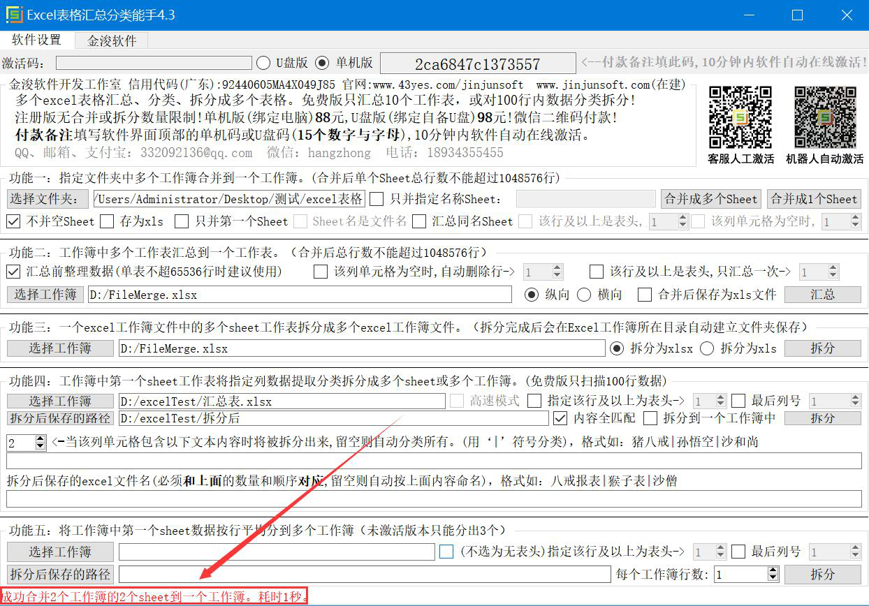 5、当Excel文件合并成功后,我们可以在Excel表格汇总分类能手操作界面左下方看到有红色字眼提示,如下图。