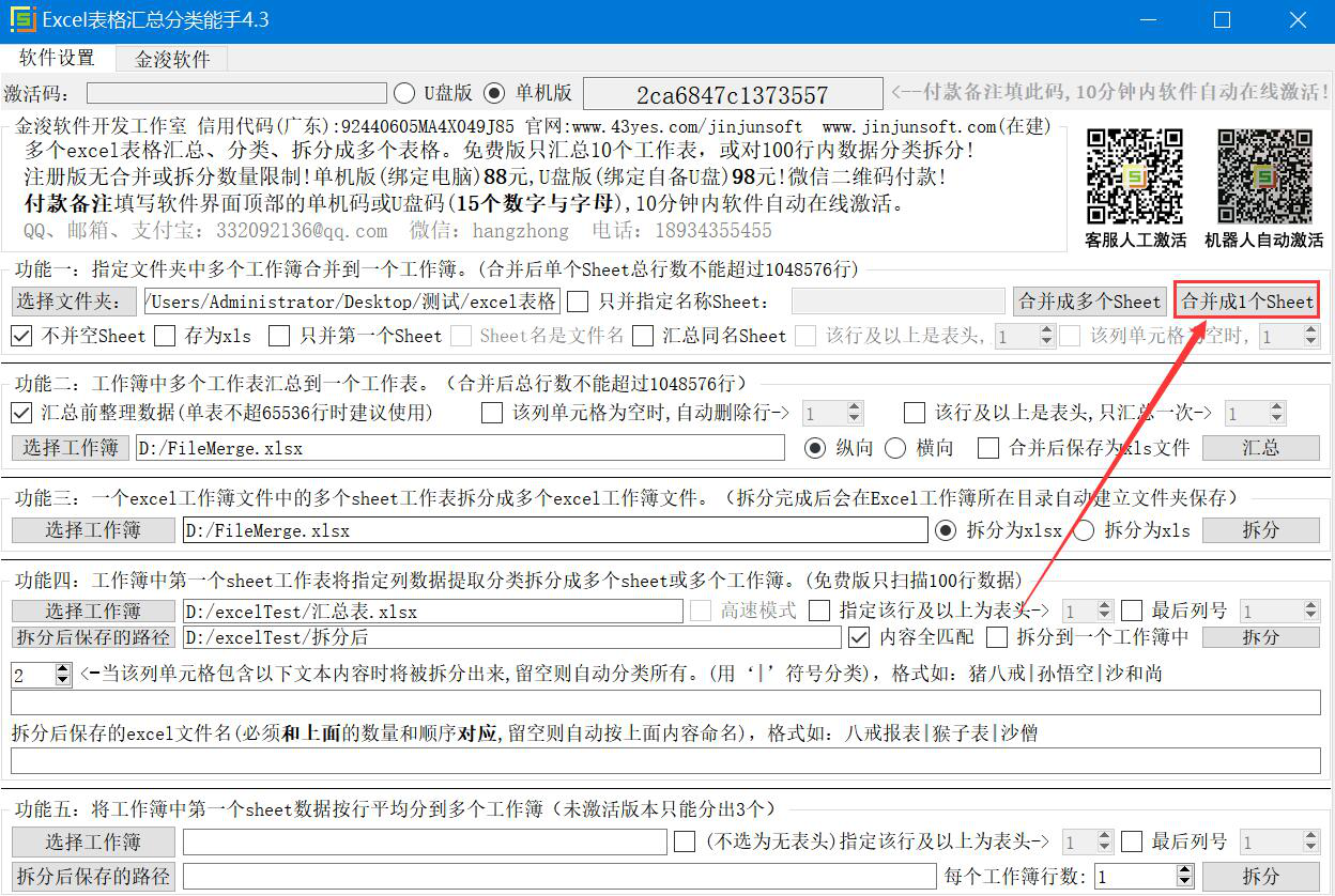 4、接下来,我们在Excel表格汇总分类能手操作界面中,点击“合并成1个Sheet”按钮,意思就是将Excel文件合并到一个工作簿的同一个Sheet中。