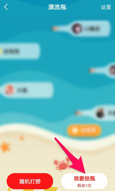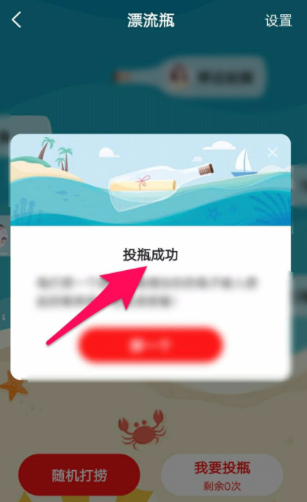 漂流瓶成功投出,这里会提示“投瓶成功”,如图所示,当然了,你也可以打捞别人的瓶子。