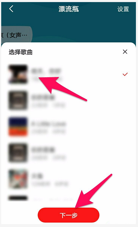 打开漂流瓶,如图,在下方点击【我要投瓶】,选择歌曲,找到自己的歌曲作品,点击它,进行下一步操作,