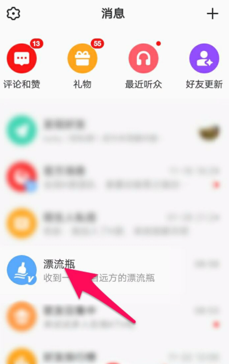 在手机中打开全民K歌,进入界面,点击底部的【消息】标签,如图,找到【漂流瓶】功能,点击它,
