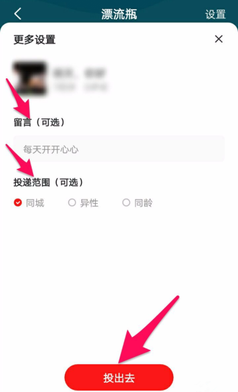 弹出界面,输入留言,选择投递范围,然后点击【投出去】按钮,