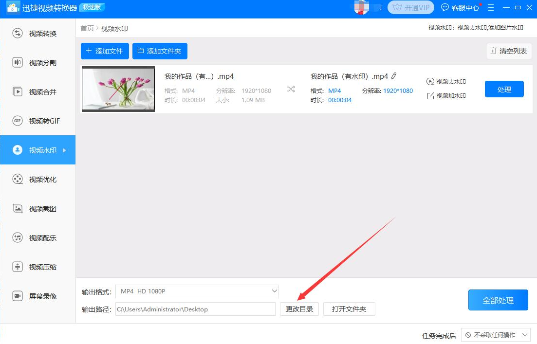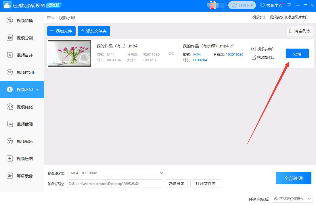 8、视频去除水印后的输出格式和输出路径都设置完成后,我们点击视频中的“处理”按钮,迅捷视频转换器便开始去除视频的水印。