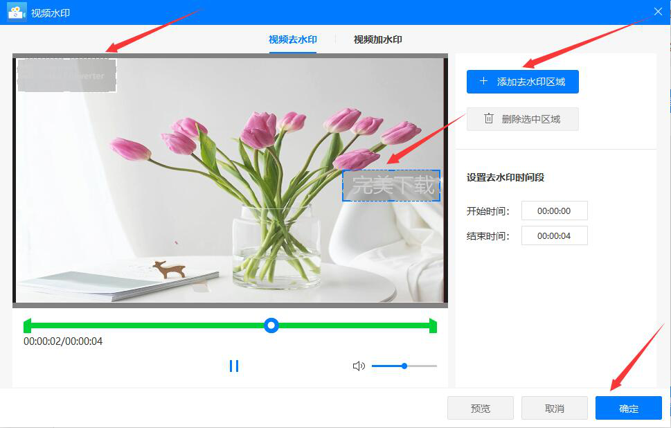 5、接下来,在弹出的视频水印编辑窗口中,我们先点击“添加去水印区域”按钮。此时,视频预览窗口中便会同步出现去水印区域选框,我们将选框完全覆盖视频上的水印,如下图,再点击“确定”按钮。