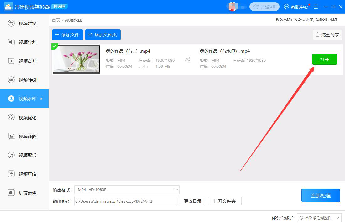 9、最后,当视频中显示如下图的绿色打钩标志,则说明迅捷视频转换器成功地去除了视频中的水印。我们点击“打开”按钮,就可以看到处理后的视频文件了。