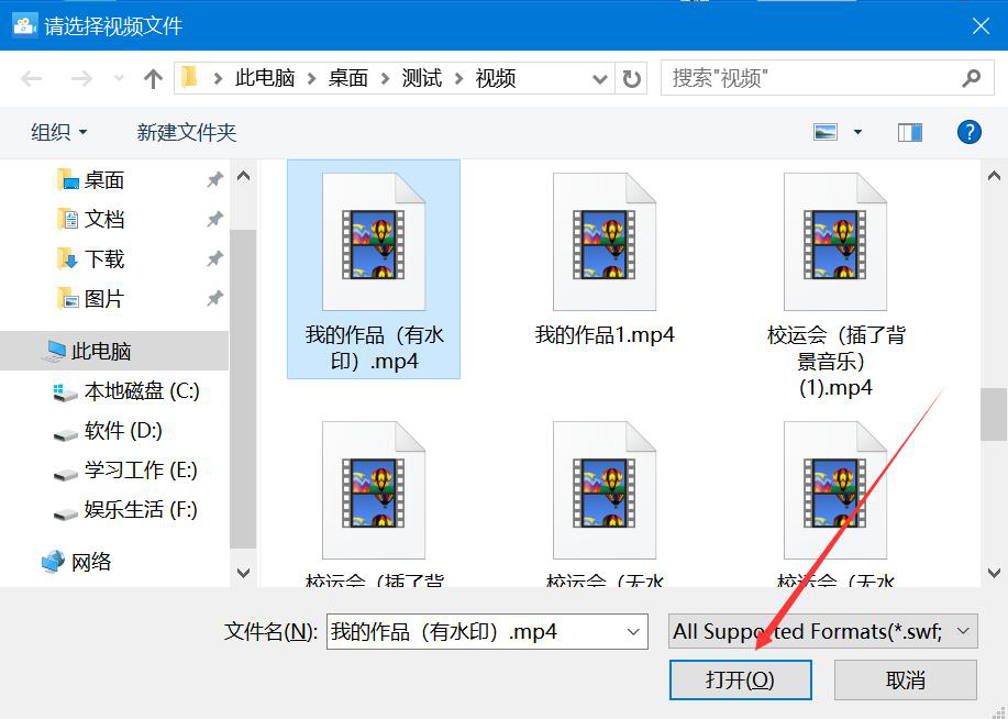 3、然后,在弹出的窗口中,我们选择需要去除水印的视频,并点击“打开”按钮,将其导入迅捷视频转换器。
