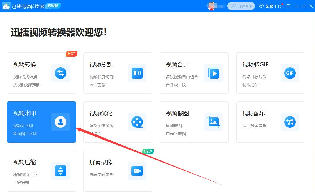 1、首先,我们打开迅捷视频转换器,在其向导页面中,点击“视频水印”功能选项。