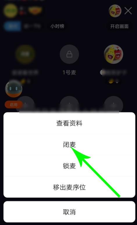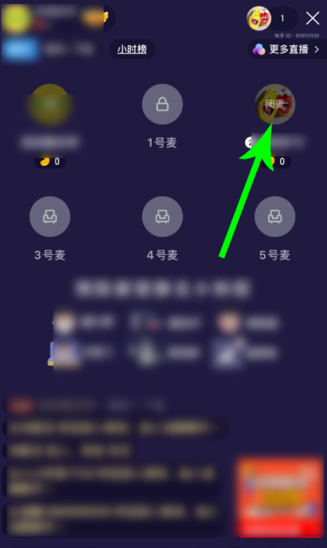 打开快手聊天室,点击上麦粉丝的头像,底部出现弹框,选择【闭麦】,