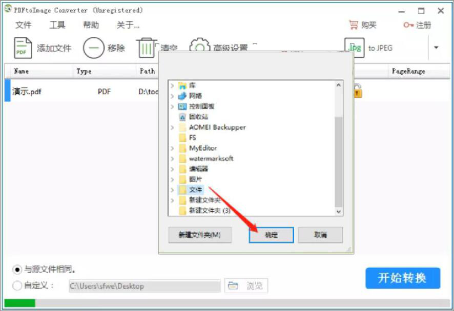 5、接下来,在PDFtoImage Converter弹出的窗口中,我们选择PDF文件转JPG后的保存路径,再点击“确定”按钮。