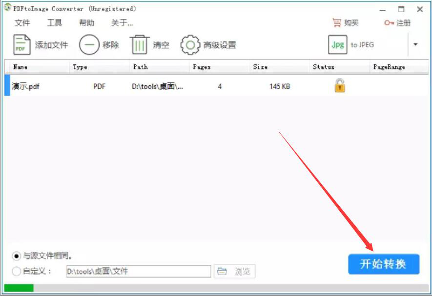 6、最后,我们点击界面右下方的“开始转换”按钮,PDFtoImage Converter便开始将PDF文件转换为JPG。